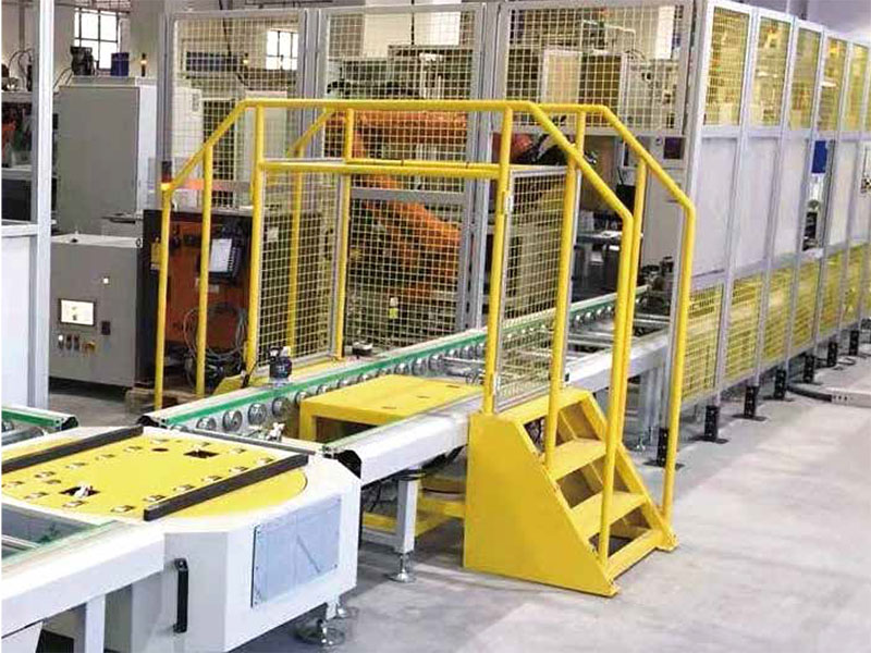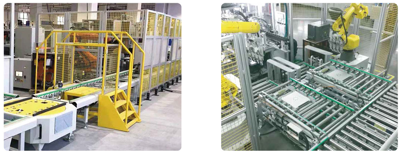 生产线优点:托盘回流到位后顶升定位,机器人自动抓取下料,空托盘进入升降机到下层回流。