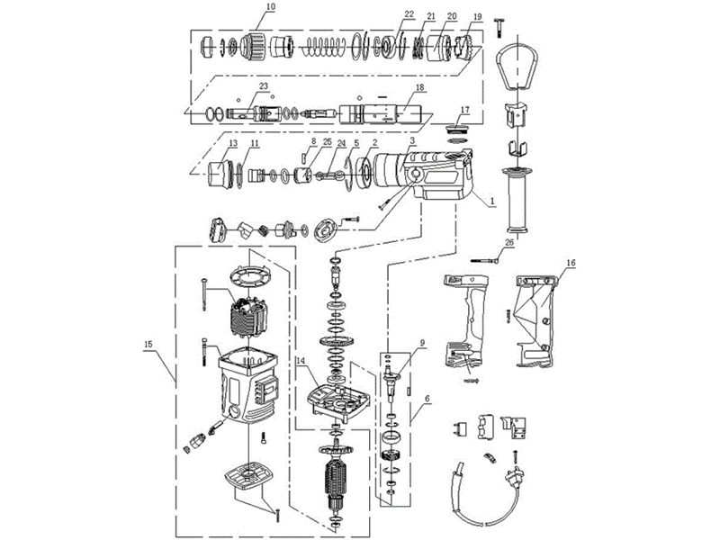 ● 在线自动模式:分别实现组件的自动化生产,并结合按钮组件、油盖组件、自动加油打油 盖、自动打螺丝、自动老化、测试、包装、码垛 及人工接线等整导线等工序,实现了电锤产品的完整自动化生产。